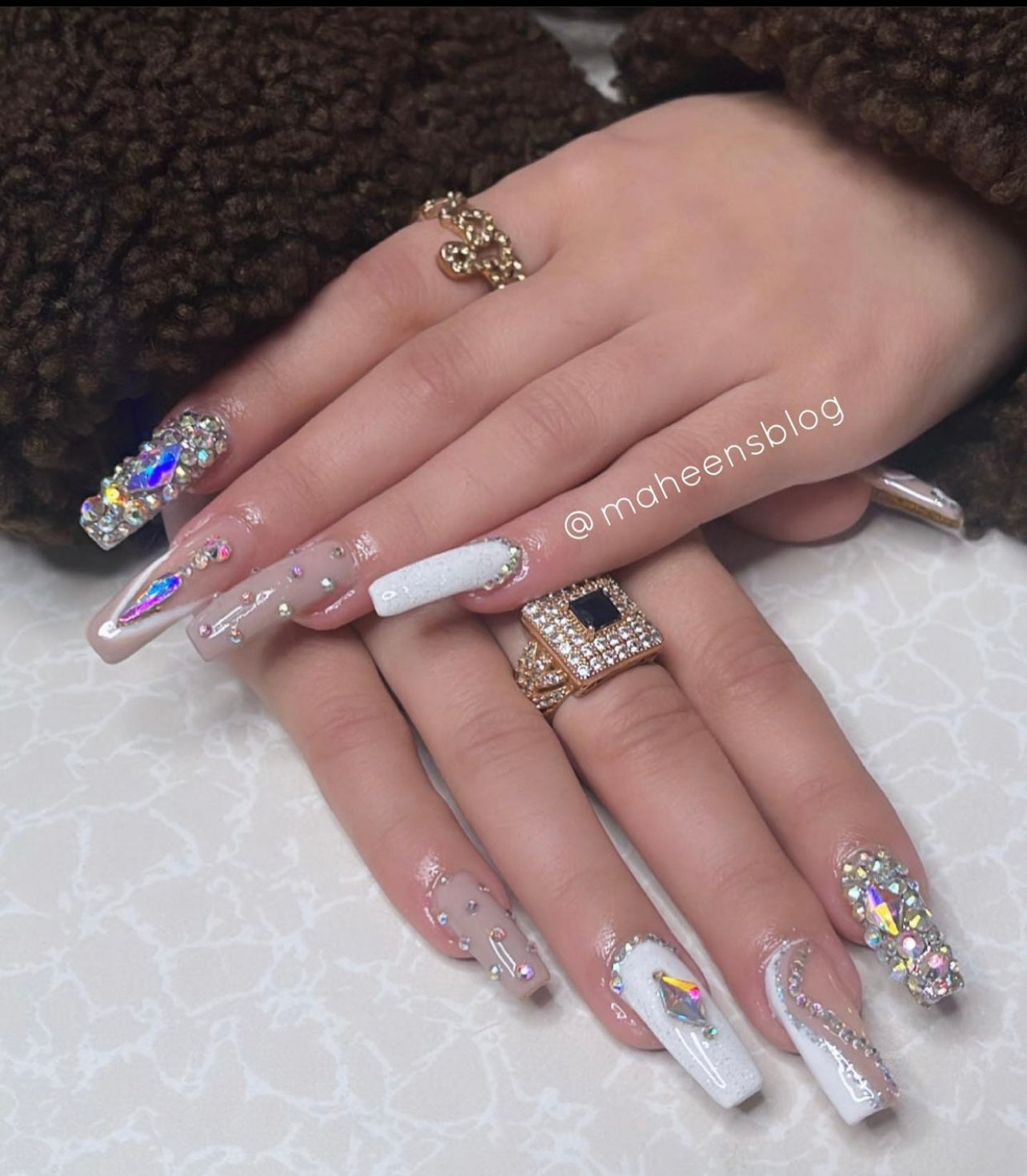 Handpainted nails in a vibrant green base, with a tamed down blue stripe running down the centre. Embellished with gold crystals.