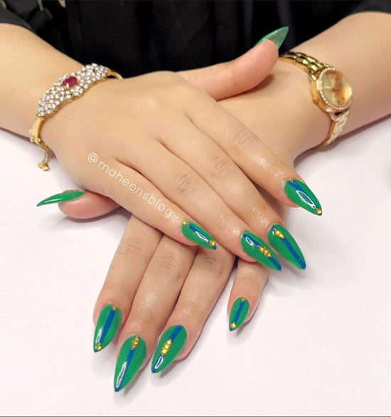 Handpainted nails in a vibrant green base, with a tamed down blue stripe running down the centre. Embellished with gold crystals.
