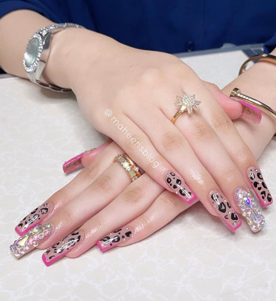 Handpainted nails with a leopard print, surrounded by neon pink. Intricate stones are added to all nails and the accent nail is covered in Swarovski crystals.